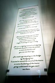 'Bird' a large format text work in engraved and back-lit painted glass, located in the bar stairwell, (completed June 2010) Click to see the full text - | ![]() |